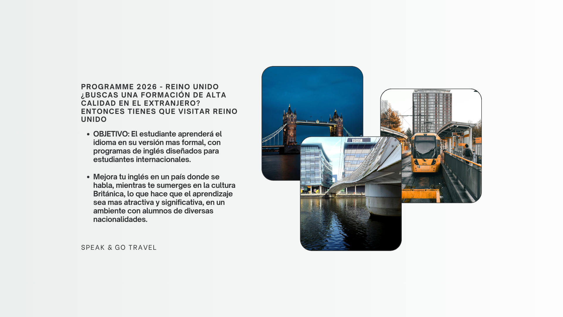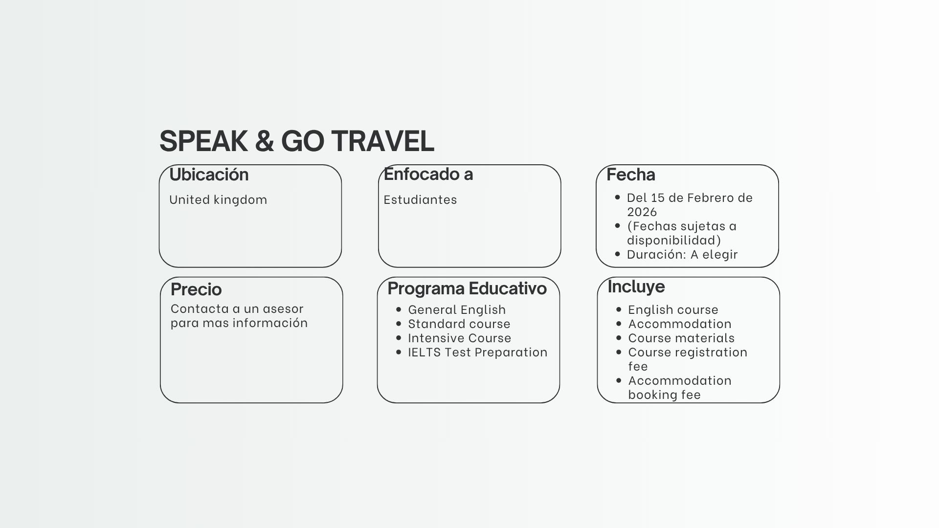 Ofrecemos la organización completa de viajes diseñados para estudiantes de todos los niveles, desde principiante hasta avanzado. Ellos podrán estudiar en nuestras escuelas asociadas, las cuales han sido cuidadosamente seleccionadas y cumplen con los más altos estándares de calidad educativa en el Reino Unido.
